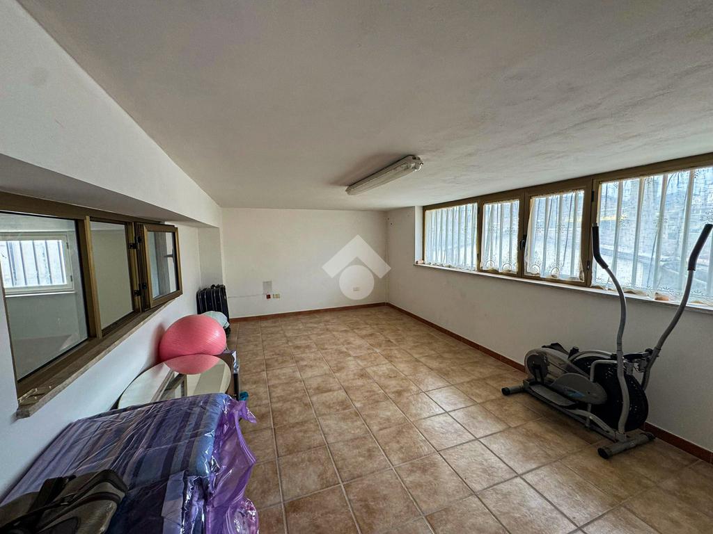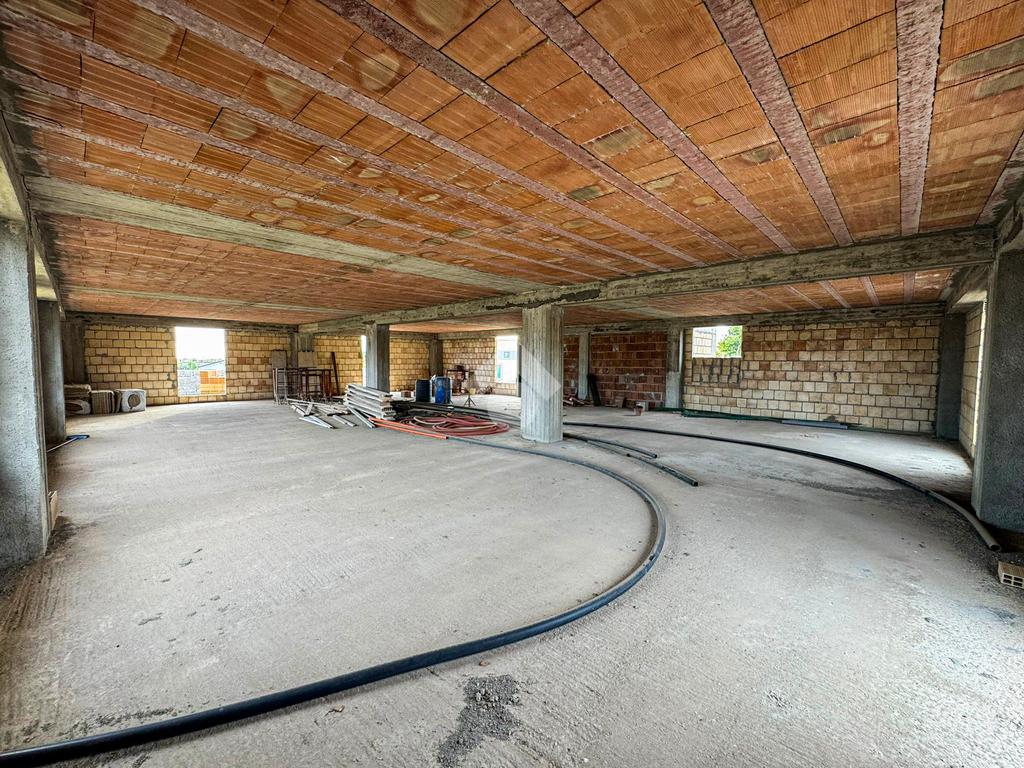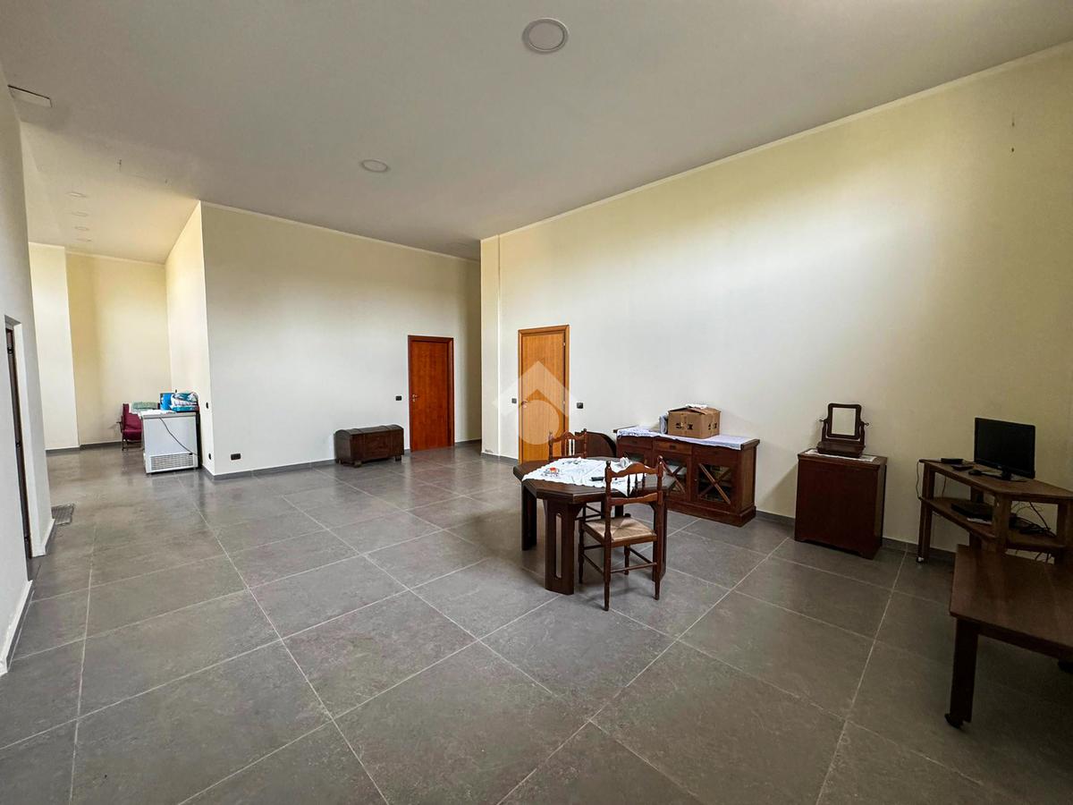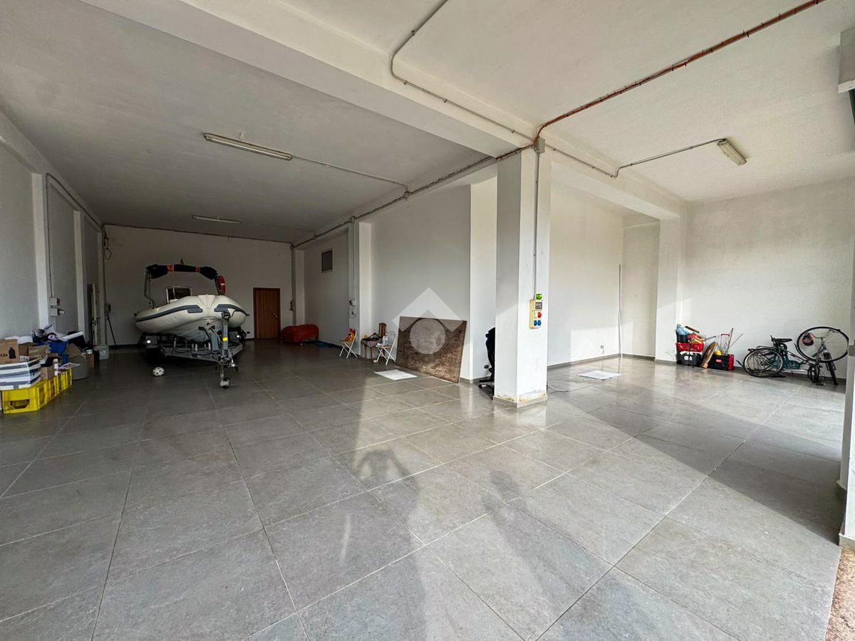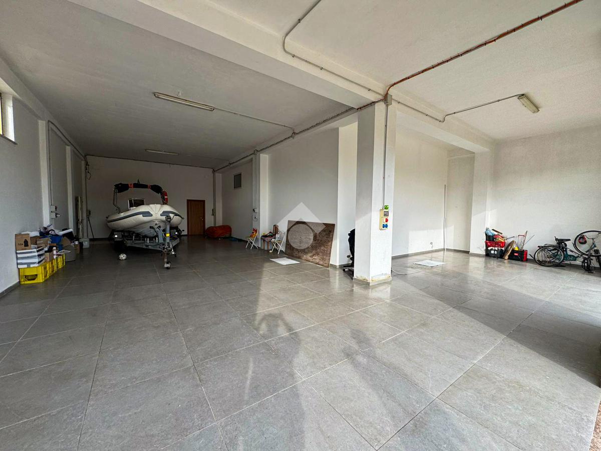 Al piano terra, un ampio magazzino di 350 mq, classificato come laboratorio (Catasto C3), offre impianti idrico ed elettrico di recente installazione, oltre a un bagno funzionale.